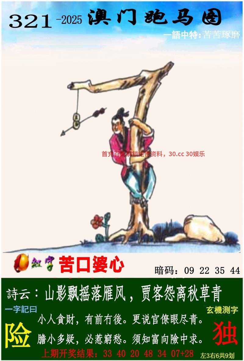 321期一字記曰:【险】小人贪财,有前冇后,更说官僚眼尽青。胆小多疑,必惹穷愁,须知富向险中求。《独》 |